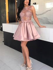 Wholesale A-Line/Princess Satin Applique Sheer Neck Sleeveless Short/Mini Homecoming Dresses