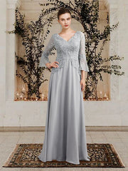 Wholesale A-Line Mother of the Bride Dress Plus Size Elegant V Neck Floor Length Chiffon Lace 3/4 Length Sleeve with Pleats Sequin Appliques - US 2 / UK 6 / EU 32