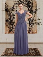 Wholesale A-Line Mother of the Bride Dress Plus Size Elegant V Neck Floor Length Chiffon Lace Sequined Short Sleeve with Pleats Appliques - US 2 / UK 6 / EU 32