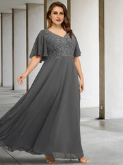 Wholesale A-Line Plus Size Curve Mother of the Bride Dresses Elegant Dress Formal Floor Length Short Sleeve V Neck Chiffon with Pleats Appliques - US 2 / UK 6 / EU 32