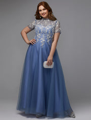 Wholesale A-Line Plus Size Dress Wedding Guest Prom Floor Length Short Sleeve High Neck Lace Lace-up with Appliques - Sky Blue / US 2 / UK 6 / EU 32