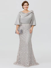 Wholesale Mermaid / Trumpet Mother of the Bride Dress Plus Size Sexy Cowl Neck Sweep / Brush Train Satin Chiffon Lace Over Satin Half Sleeve No with Appliques