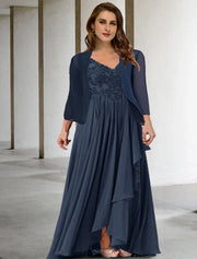 Wholesale Two Piece A-Line Mother of the Bride Dresses Plus Size Hide Belly Curve Elegant Dress Formal Floor Length Half Sleeve V Neck Chiffon with Pleats Appliques