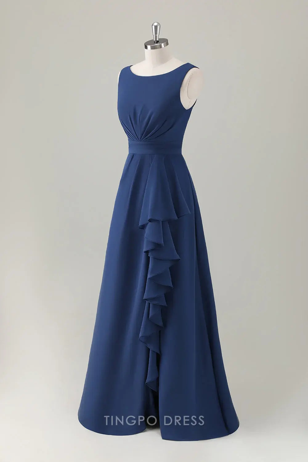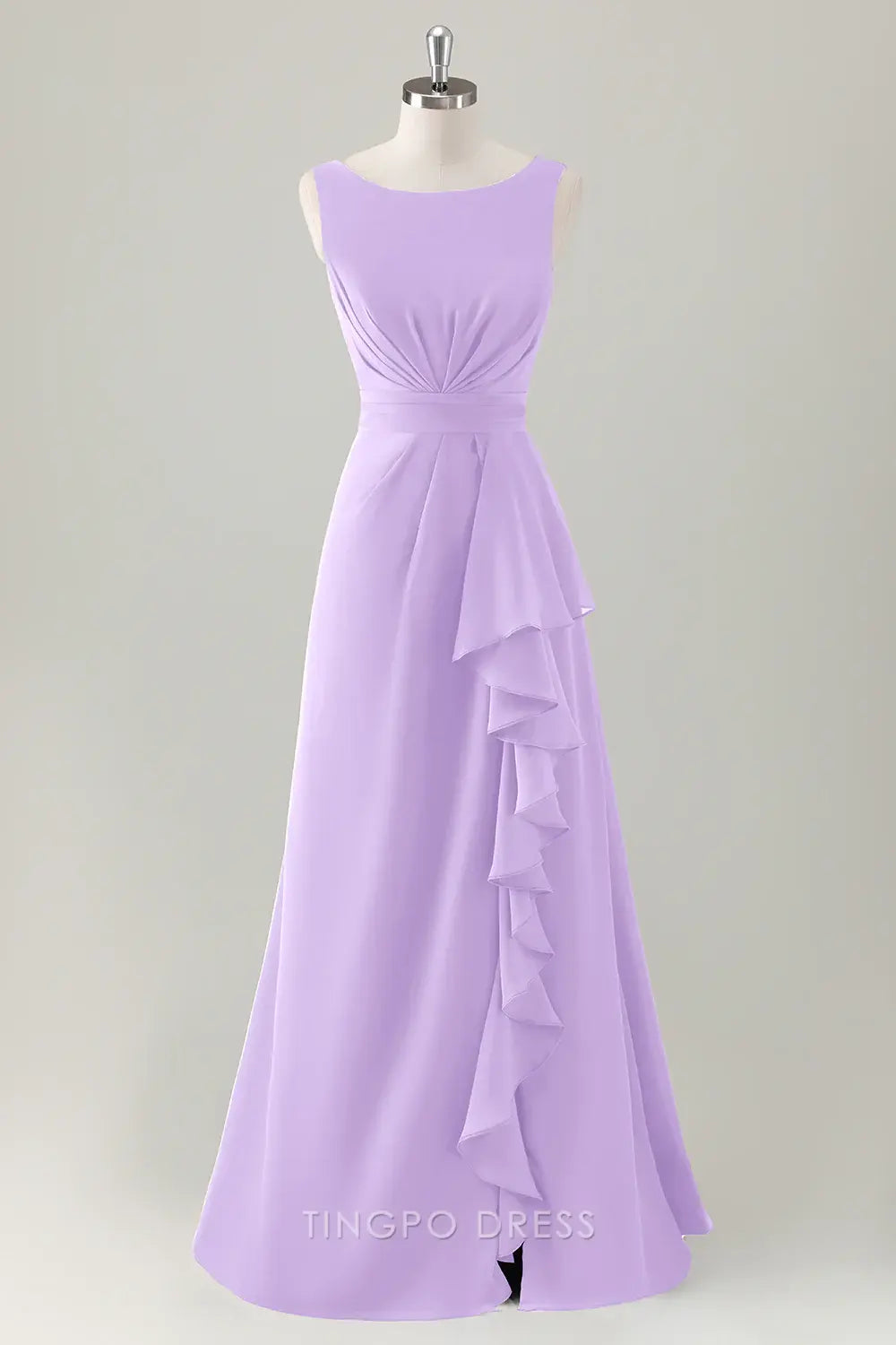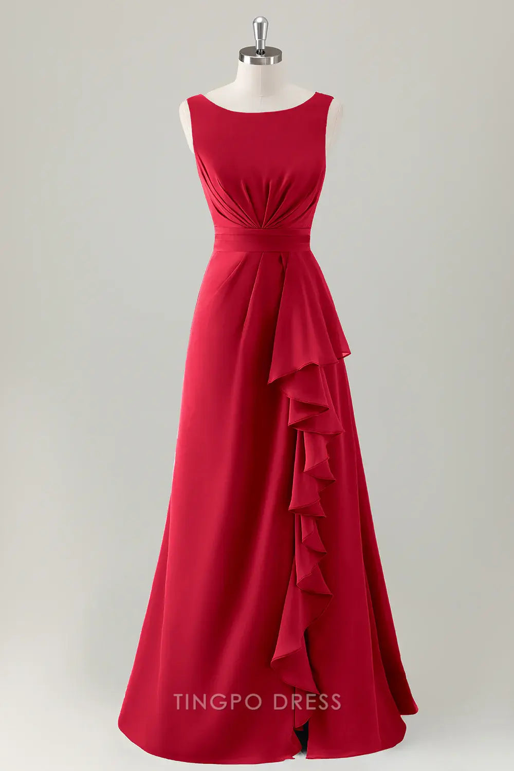 Elegant A-Line Boat Neck Ruffled Side Slit Floor-Length Maxi Dress Prom Dress