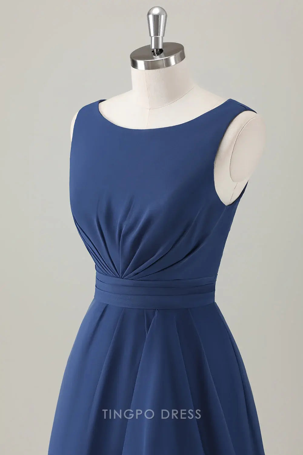 Elegant A-Line Boat Neck Ruffled Side Slit Floor-Length Maxi Dress Prom Dress - Dark Blue / US 2 / UK 6 / EU 32
