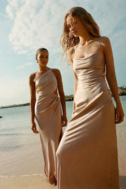 Exude understated glamorous charm with Tingpo's champagne maxi dress, crafted from lustrous satin (delivering a sleek, fluid drape and subtle sheen). It features a modern one-shoulder design (for feminine allure), ruched detailing (enhancing texture and a figure-hugging fit), a side cutout (adding subtle sophistication), and a high thigh slit (for dynamic movement). The soft champagne hue balances timeless elegance and warm radiance, making it ideal for wedding guest events, upscale evening dinners, semi-formal parties, or cocktail occasions. Its polished, refined appearance delivers a memorable, confident impression.