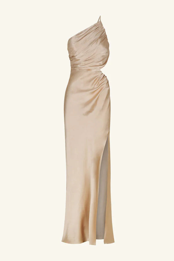 Satin One-Shoulder Ruched Cutout prom dress: Suitable for: proms, formal dinners, black-tie weddings, and upscale parties.