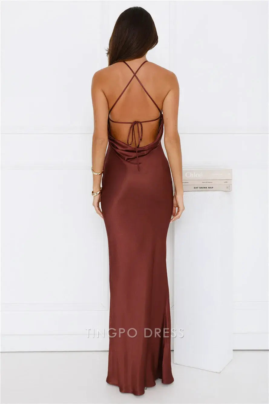 Step into elegance with Tingpo's Chocolate halter neck maxi dress. Adorned with a lovely floral accent at the neckline, it features a stunning open back with criss - cross straps for a touch of allure. Crafted from smooth fabric, it hugs your figure beautifully, making it perfect for formal events, weddings,prom, or special evenings.