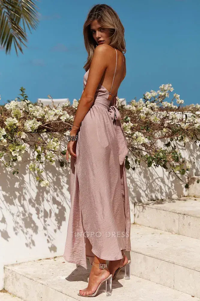 Step into summer elegance with Tingpo's halter neck maxi dress. Featuring a trendy cutout detail at the chest, a daring high slit, and an open back with a self - tie bow, it's crafted from a lightweight fabric that flows beautifully. Perfect for beach vacations, outdoor parties,prom, or any occasion where you want to showcase effortless style and allure.