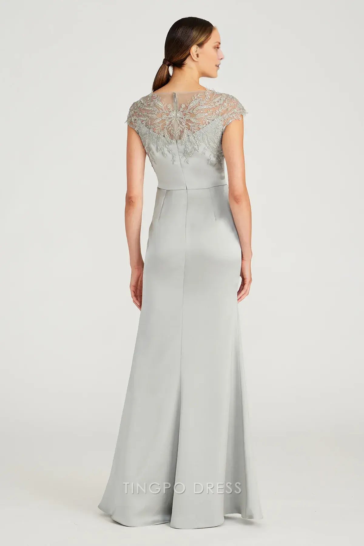 Step into refined elegance with Tingpo's lace-embellished cap-sleeve satin mermaid maxi dress. The delicate sheer cap sleeves (adorned with intricate beaded lace), paired with smooth satin fabric, highlights your silhouette beautifully, while the mermaid skirt adds layers of sophistication and allure. The soft silver-gray hue creates a stunning, timeless fit, perfect for formal weddings or evening galas. The lustrous satin material further elevates its appeal, ensuring you exude grace at any upscale occasion.