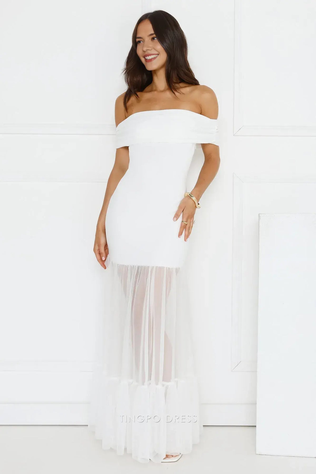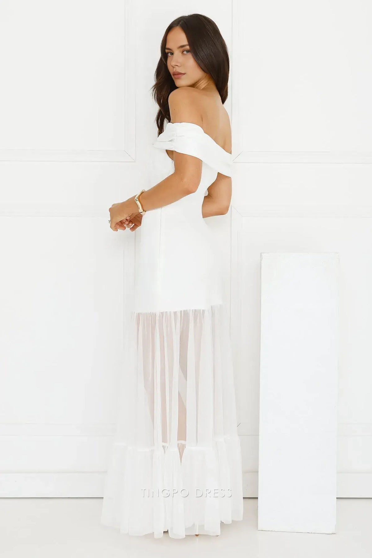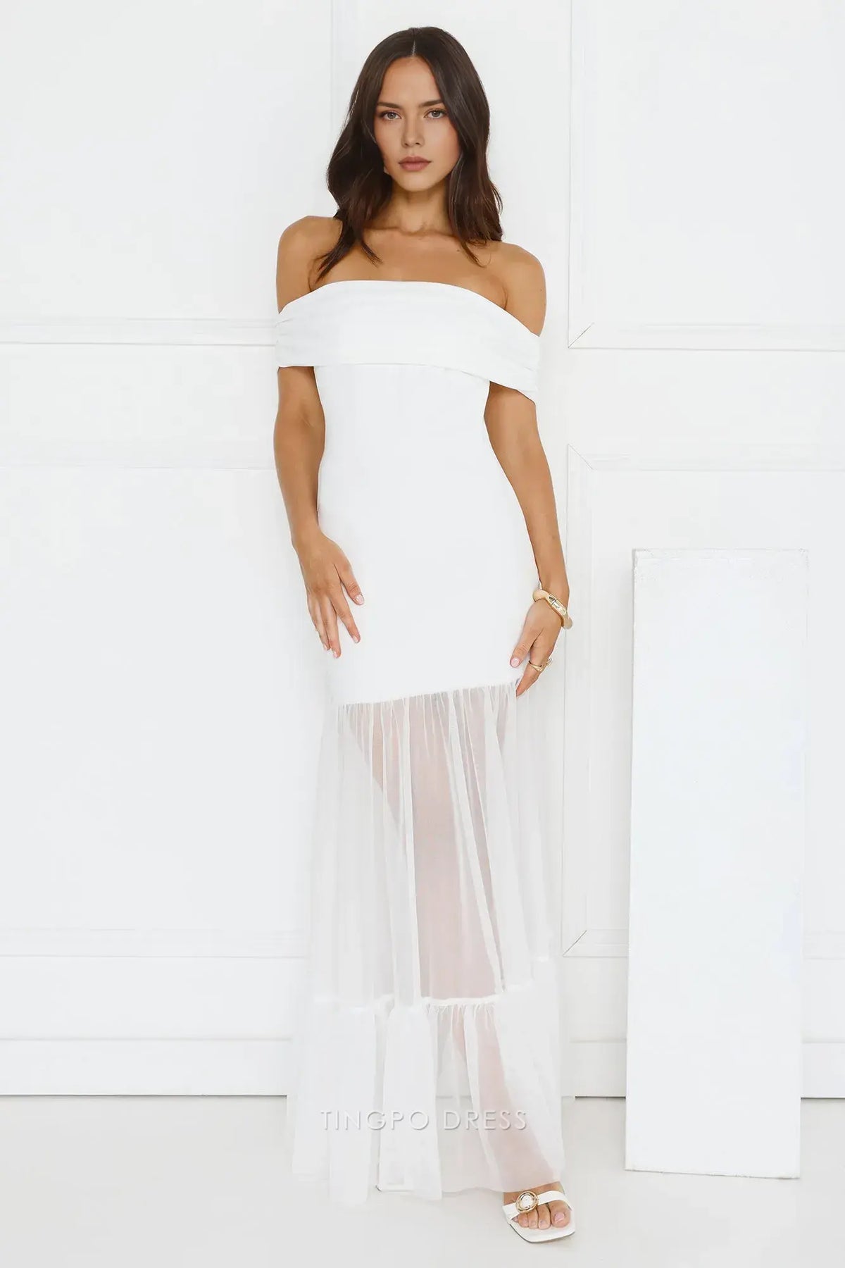 Step into elegance with Tingpo's off - shoulder maxi dress. Featuring a chic off - shoulder neckline, a fitted bodice, and a flowing skirt with a sheer mesh hem, it's crafted from a smooth fabric that drapes beautifully. The mesh detail adds a touch of allure, making it perfect for formal events, weddings,prom, or any occasion where you want to showcase timeless grace with a hint of sophistication.