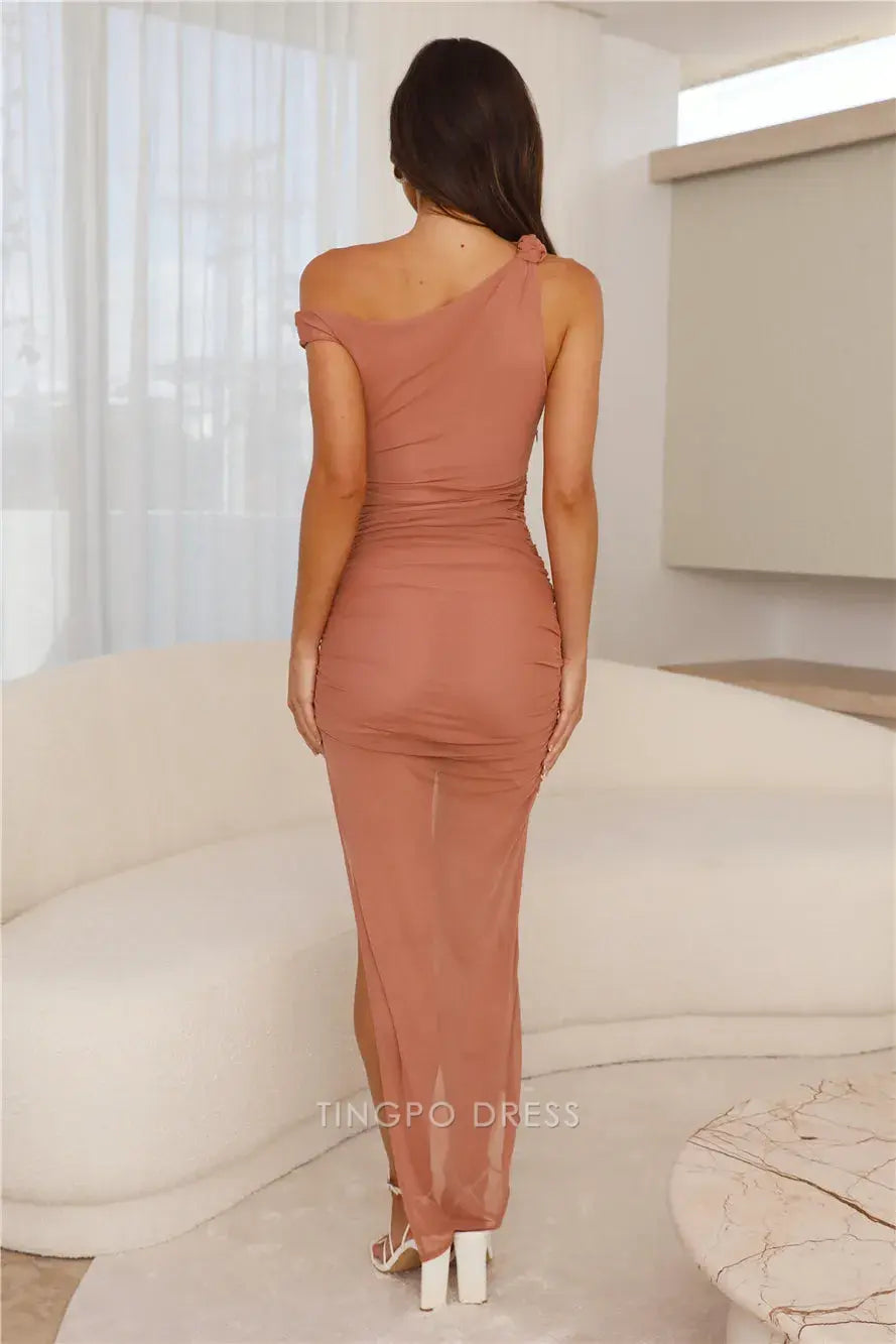 Step into glamour with Tingpo's one - shoulder maxi dress. Featuring ruched detailing on the bodice, a sheer mesh overlay with a daring high slit, and an asymmetrical neckline, it's crafted from a soft fabric that hugs your curves beautifully. Available in multiple sophisticated colors, it's perfect for formal events, parties,prom, or any occasion where you want to showcase timeless allure with a modern twist.