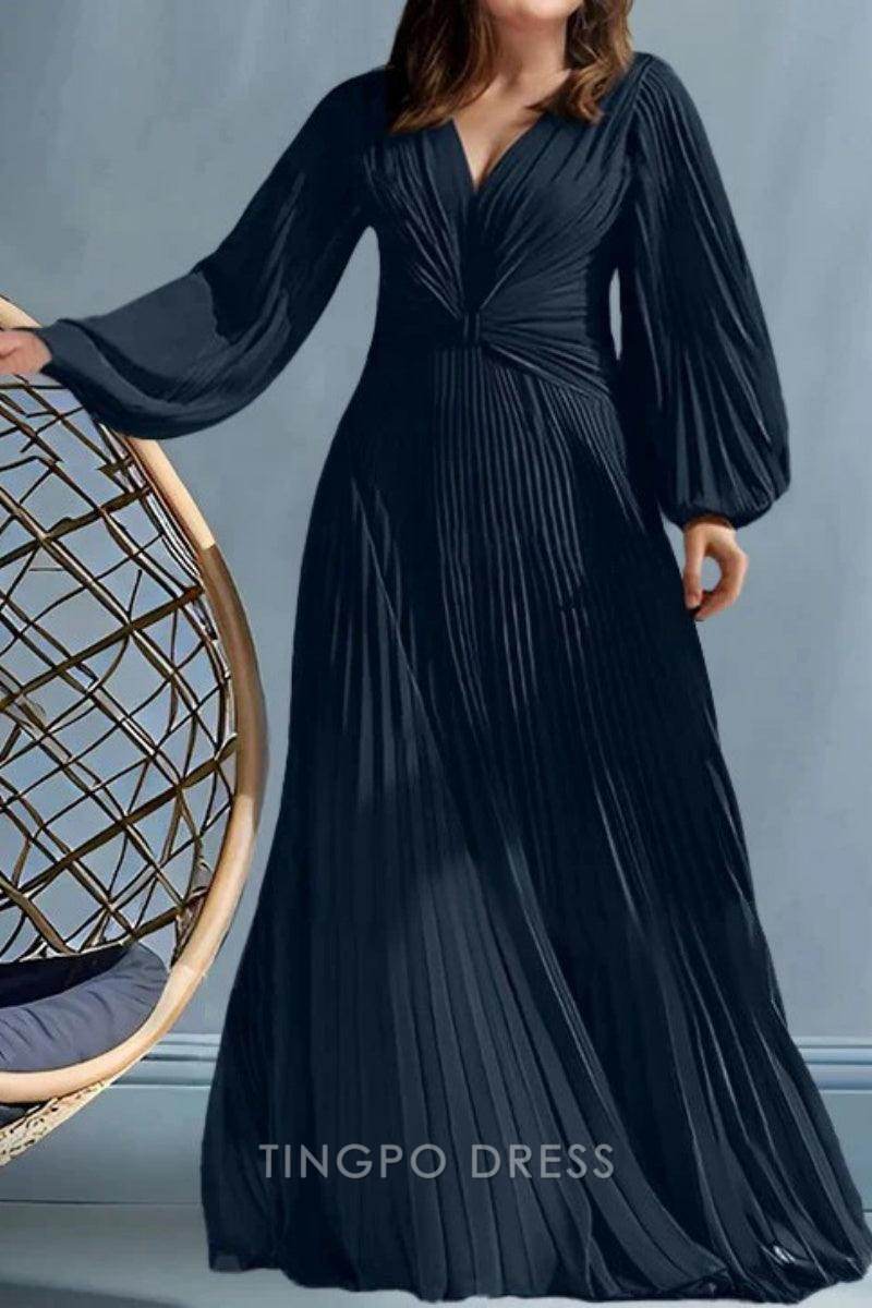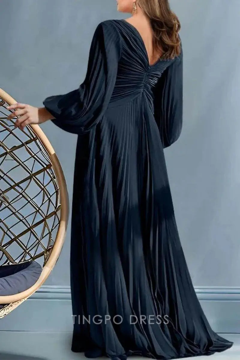 Elegant Plunging V - Neck Pleated Balloon Sleeve Maxi Dress with Open Back Prom Dress