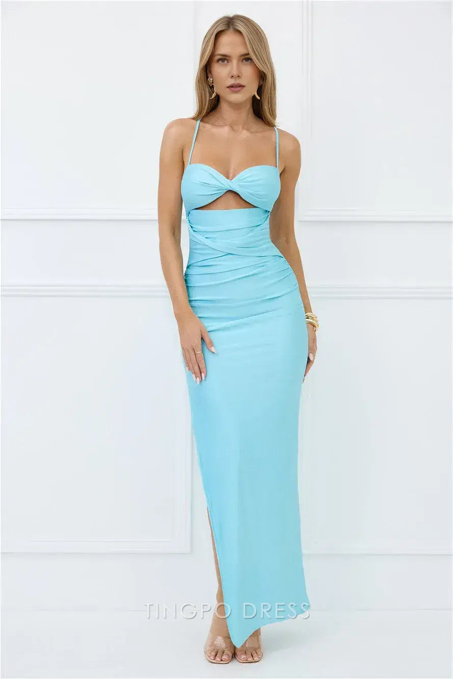 Make a statement with Tingpo's cutout front maxi dress. Featuring delicate spaghetti straps, a trendy cutout at the chest, and a criss - cross back design, it hugs your curves beautifully. Available in navy and brown, this dress is perfect for formal events, parties,prom, or special evenings. The flowing silhouette and chic details ensure you stand out.
