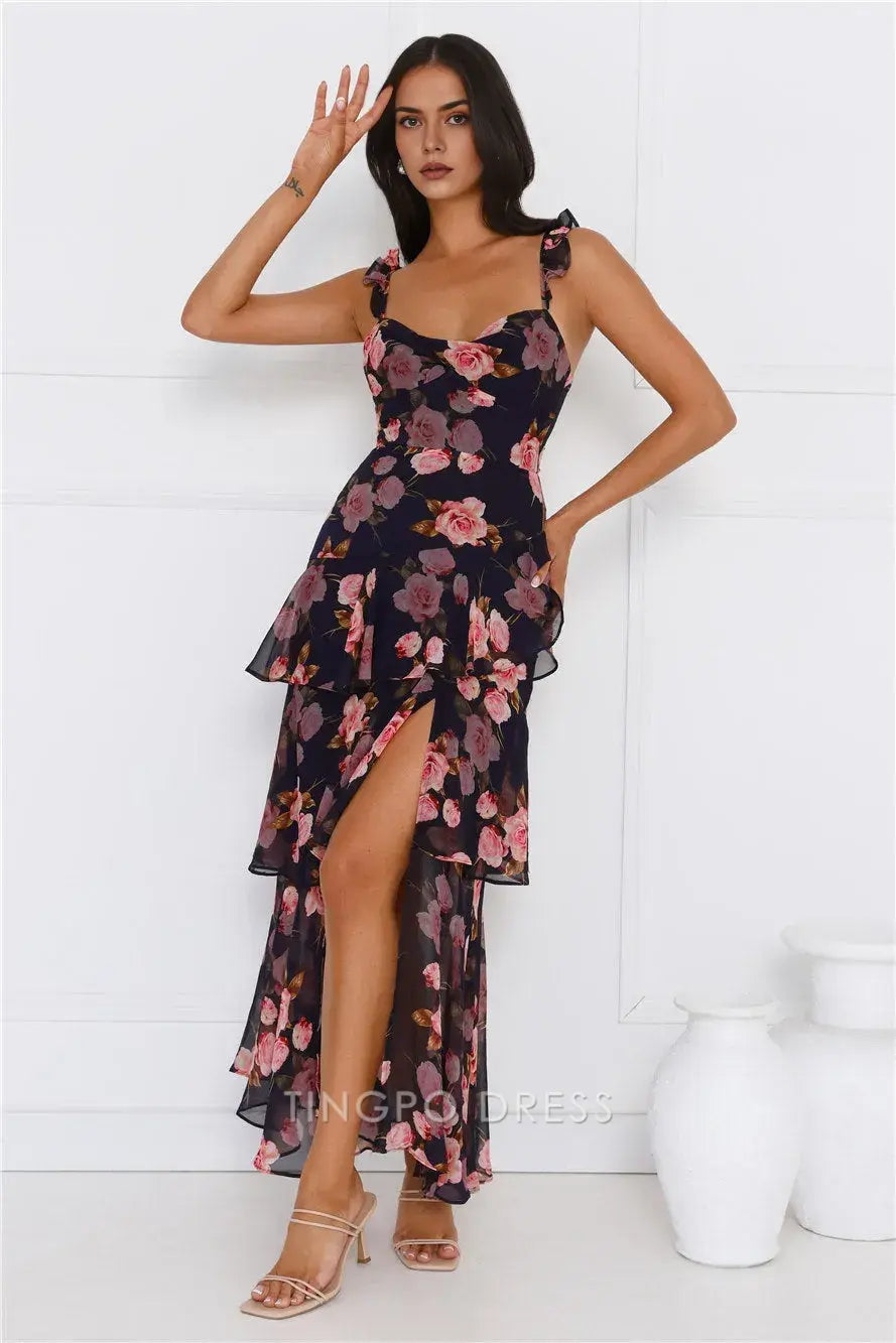 Embrace romance with Tingpo's floral print maxi dress. It boasts ruffled straps, a sweetheart neckline, and a tiered skirt for a flowy feel. The open back with a bow detail adds allure, making it perfect for weddings,prom, garden parties, or special dates. Lightweight fabric ensures comfort.