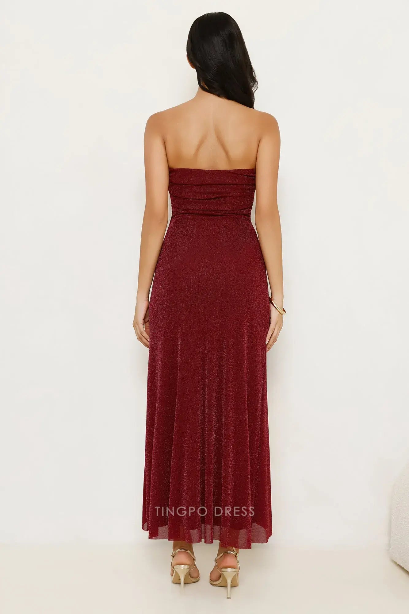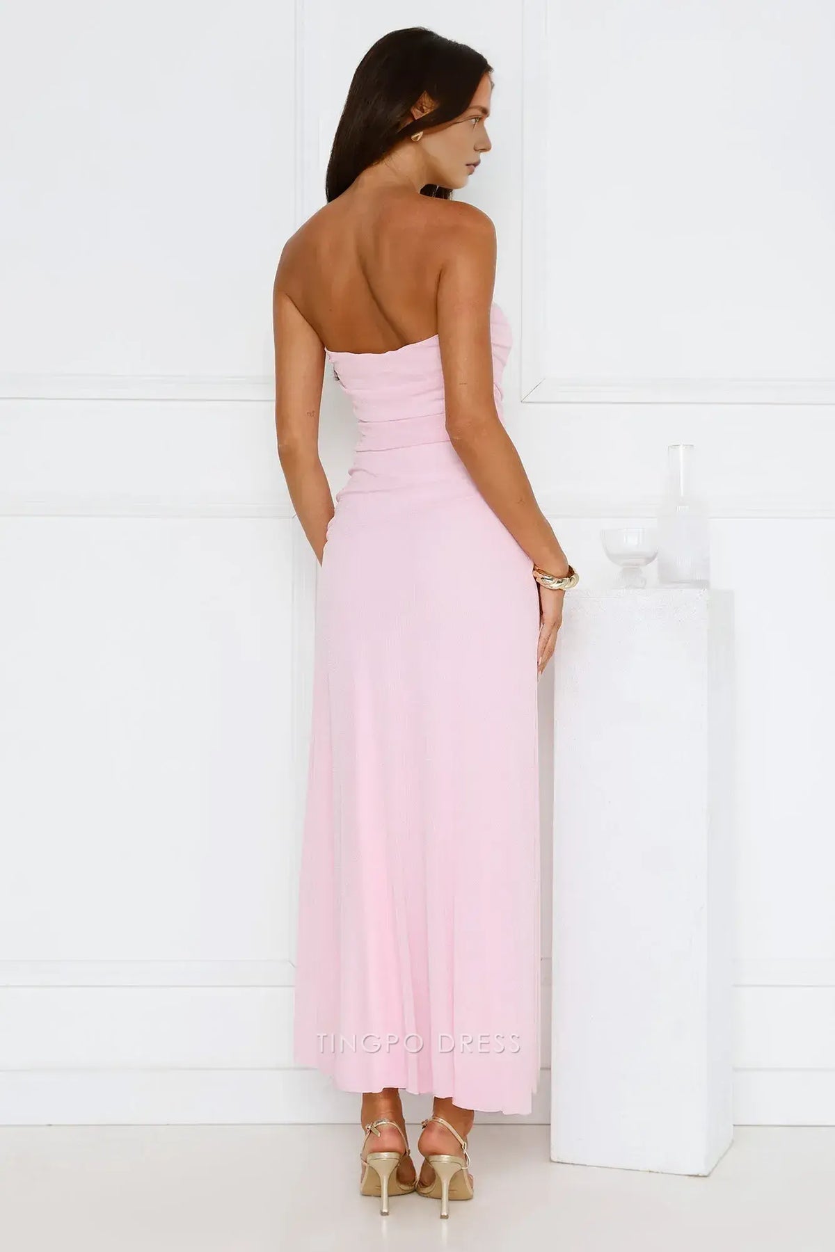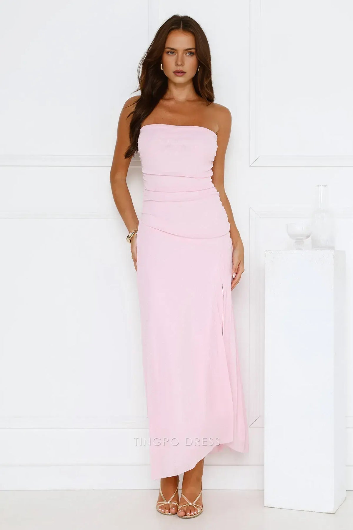 Step into elegance with Tingpo's strapless maxi dress. Featuring ruched detailing at the bodice, a daring high slit, and a flowing silhouette, it's crafted from a soft fabric that hugs your curves beautifully. Available in multiple sophisticated colors, it's perfect for formal events, parties, prom, or any occasion where you want to showcase timeless grace with a touch of allure.
