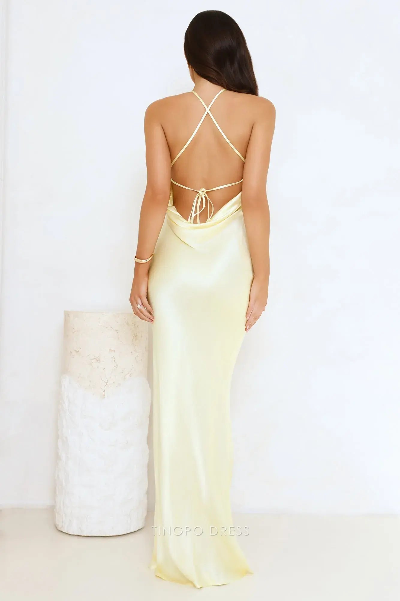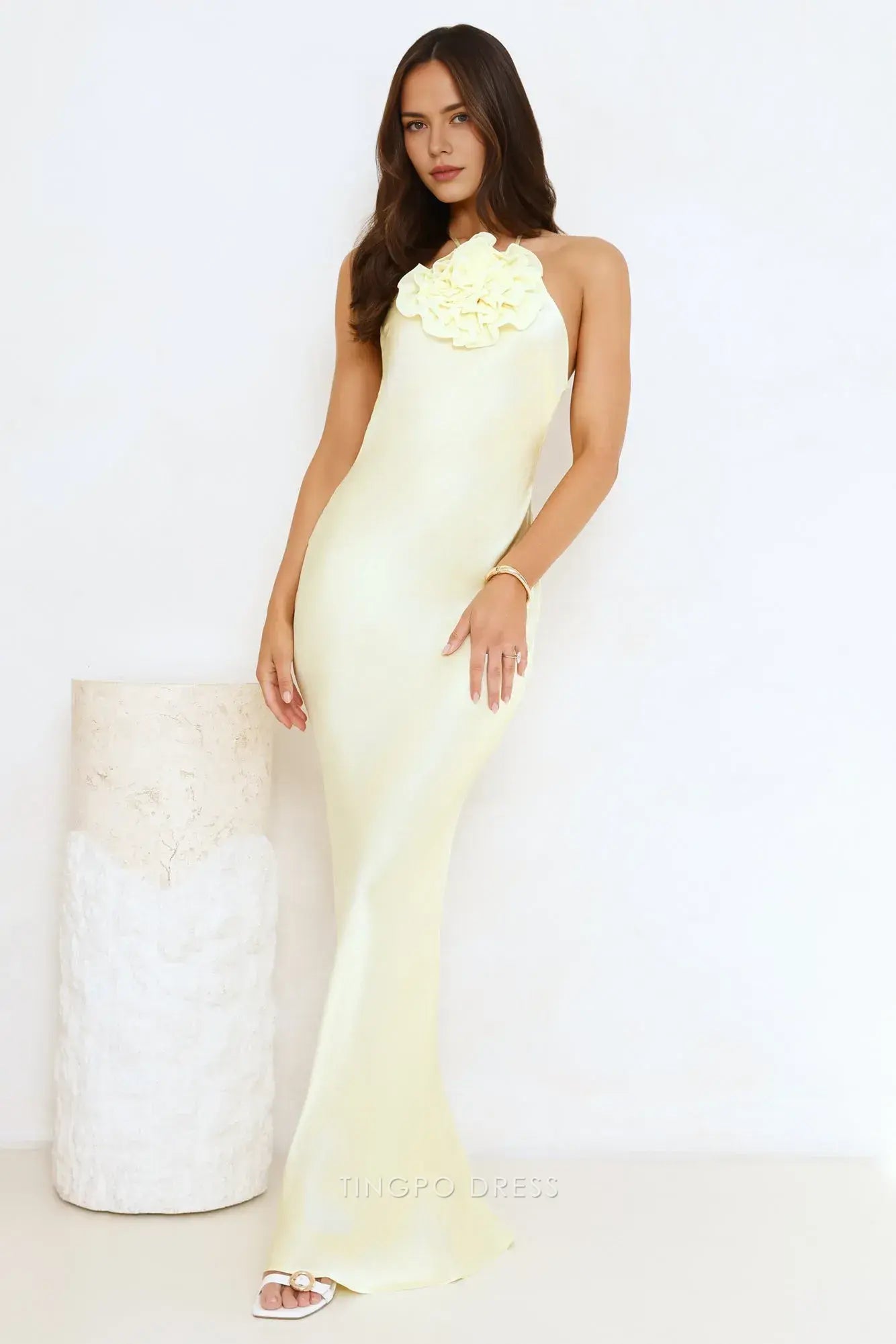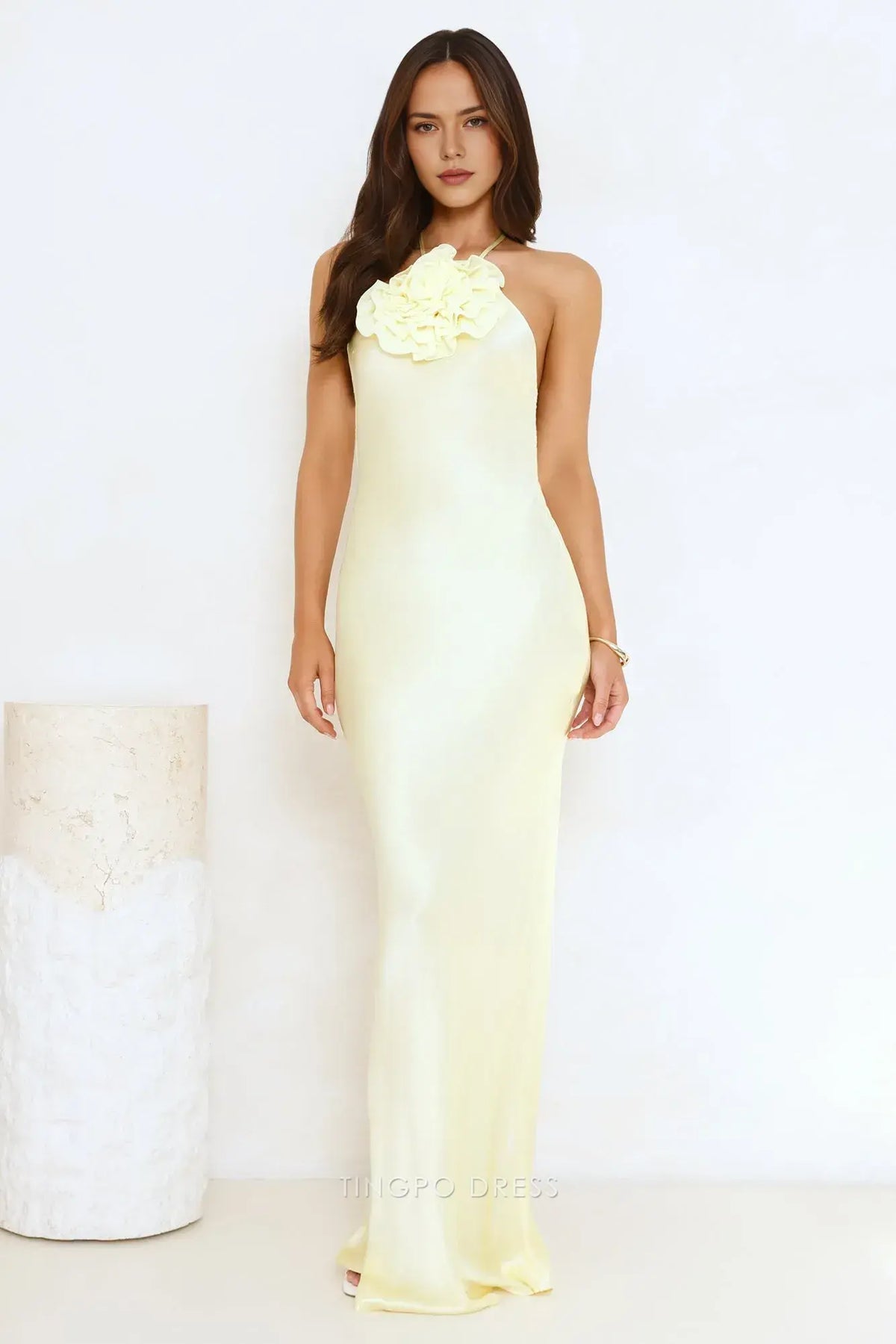 Step into elegance with Tingpo's yellow halter neck maxi dress. Adorned with a lovely floral accent at the neckline, it features a stunning open back with criss - cross straps for a touch of allure. Crafted from smooth fabric, it hugs your figure beautifully, making it perfect for formal events, weddings,prom, or special evenings.