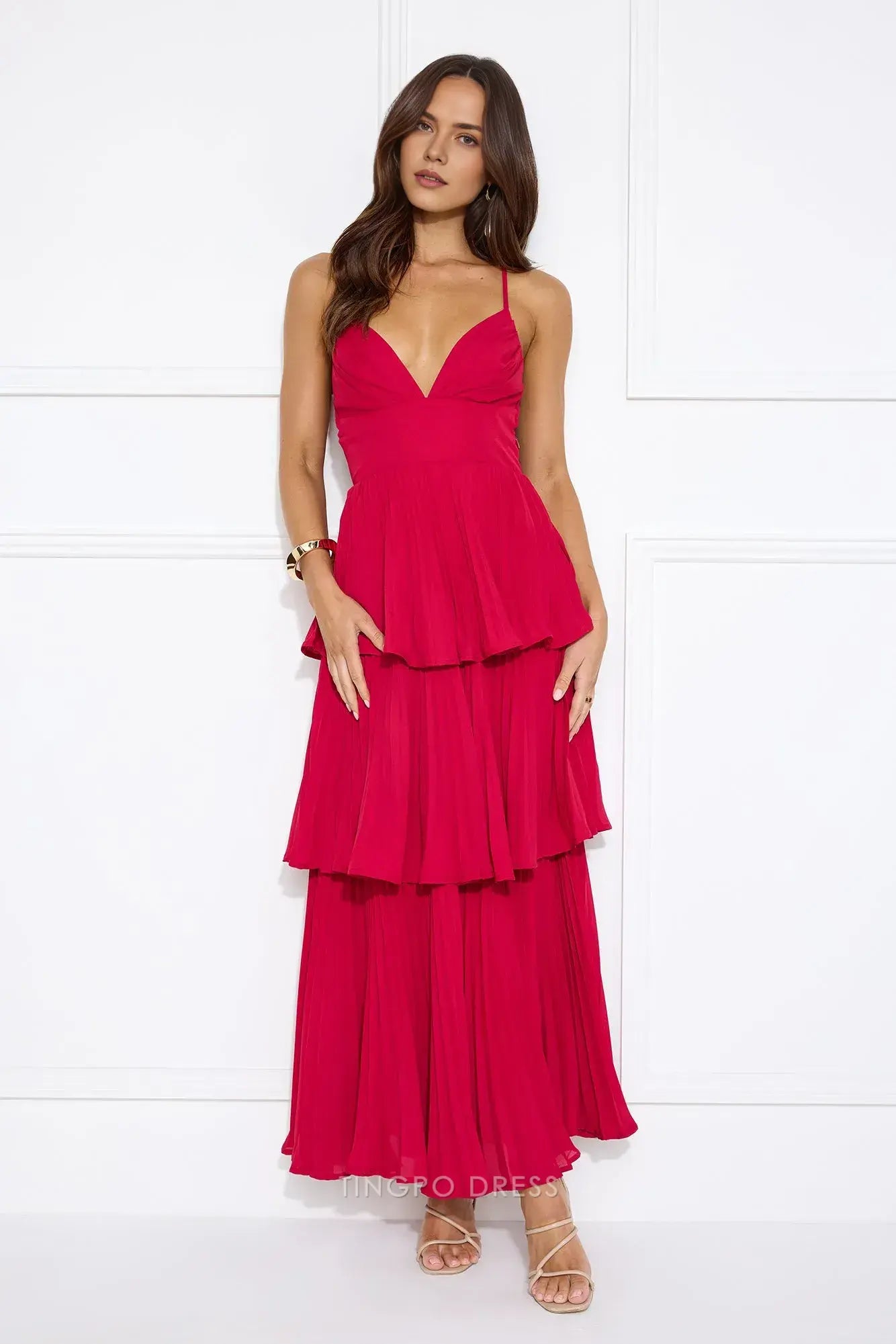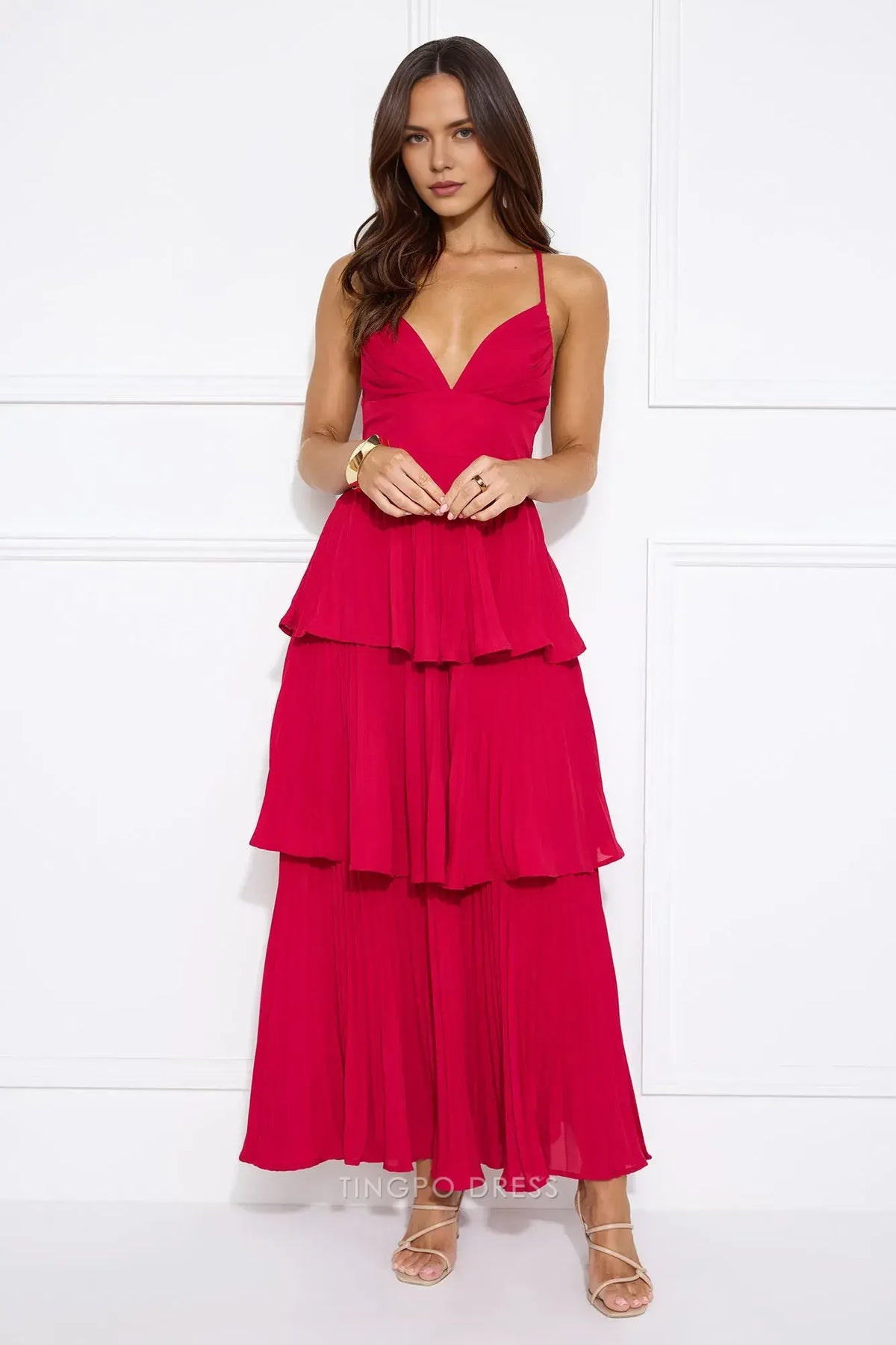 Elevate your style with Tingpo's red tiered pleated maxi dress. The deep V - neckline adds a touch of allure, while the flowing tiered pleated skirt ensures graceful movement. The criss - cross back design with a tie detail brings a stylish and unique element, making it perfect for special events, weddings,prom, or any occasion where you want to stand out with elegance.