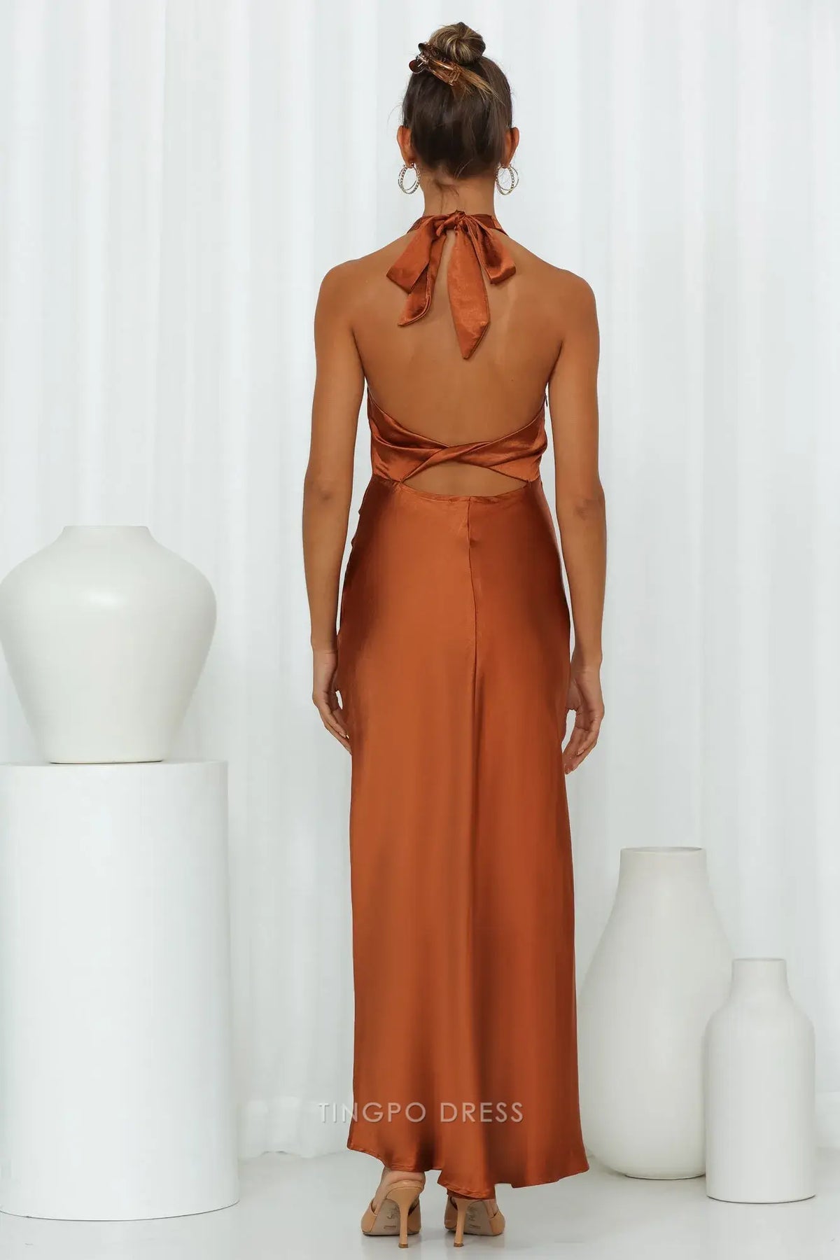 Elevate your evening elegance with Tingpo's satin halter neck maxi dress. The halter neck design and open back with a tie detail add a touch of allure, while the high slit ensures graceful movement. Crafted from luxurious satin, it's perfect for formal events,prom, galas, or any special occasion where you want to make a sophisticated statement.