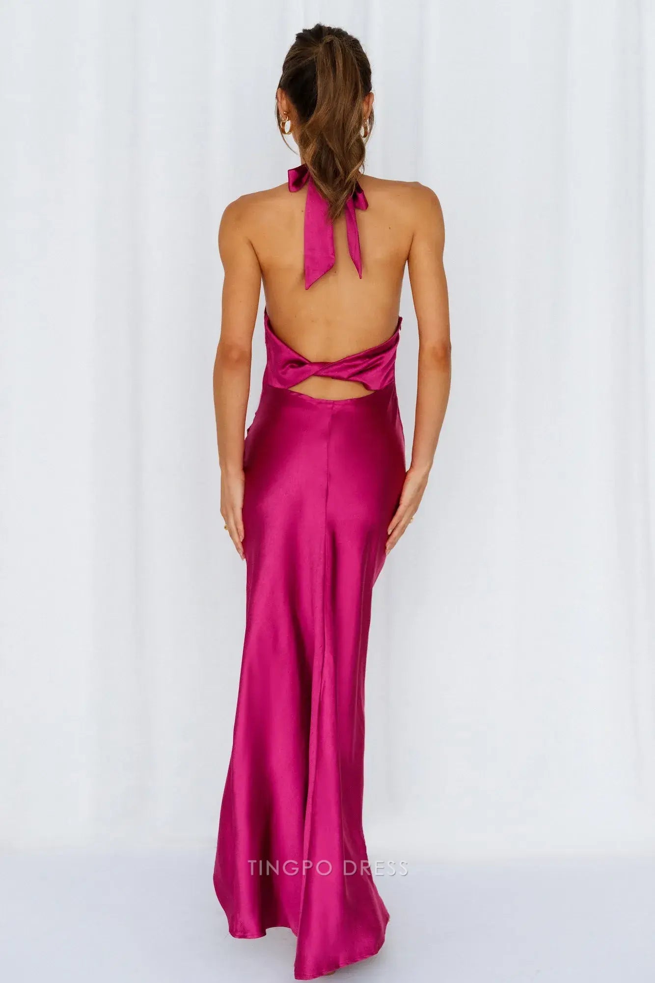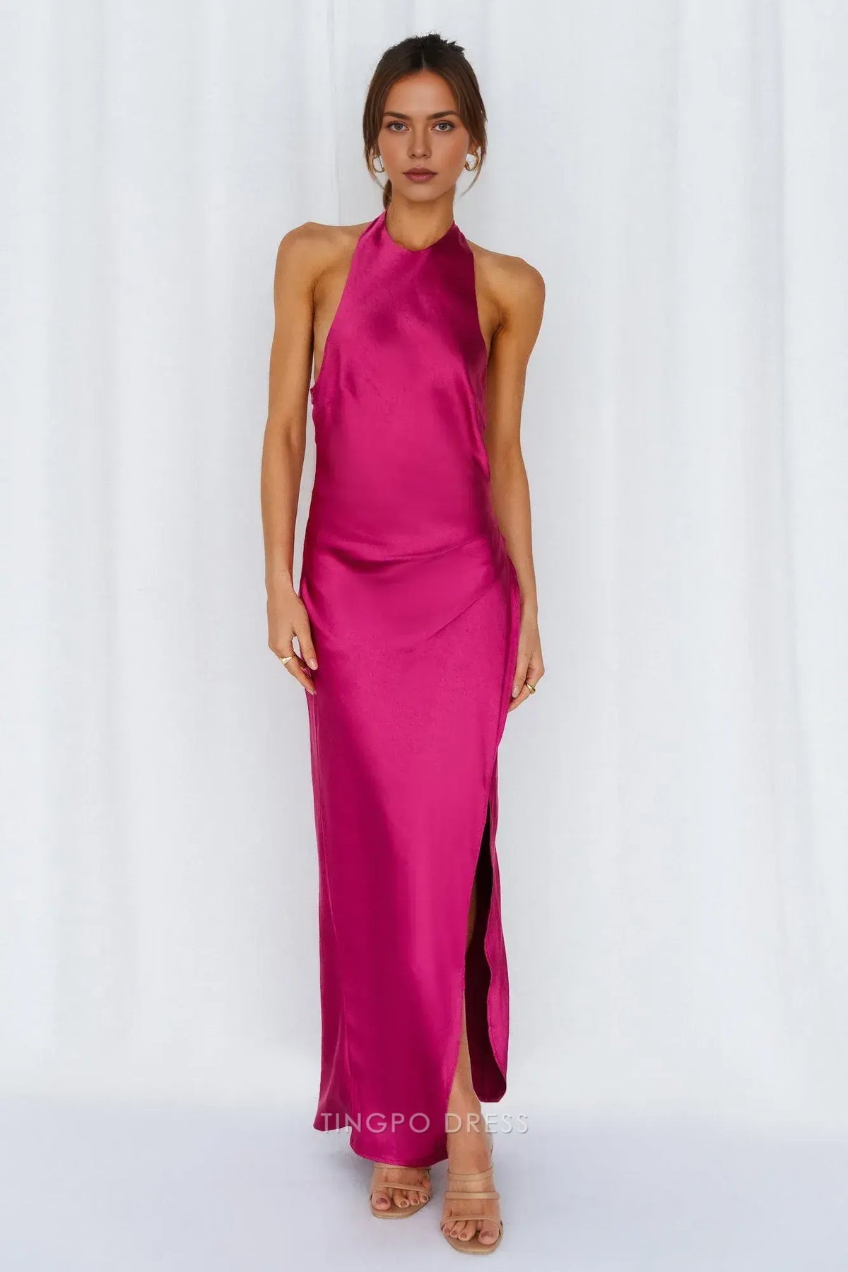 Elevate your evening elegance with Tingpo's satin halter neck maxi dress. The halter neck design and open back with a tie detail add a touch of allure, while the high slit ensures graceful movement. Crafted from luxurious satin, it's perfect for formal events, galas, prom,or any special occasion where you want to make a vibrant and sophisticated statement.