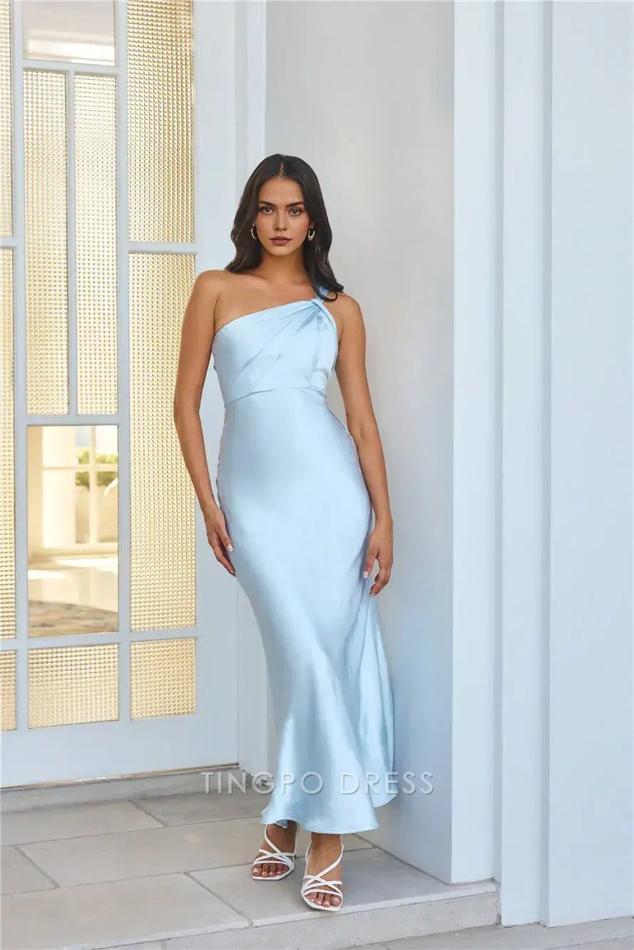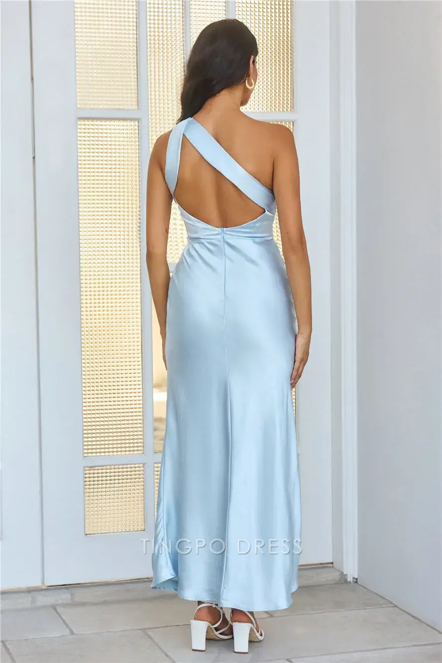 Tingpo's Simple Sheath prom dress showcases a sleek one-shoulder design with a sleeveless cut that offers a modern, minimalist look. The open back detail adds an element of allure while maintaining elegance. With its ankle-length silhouette, this column-style dress provides a streamlined fit that flatters the figure, making it an excellent choice for prom or formal events where understated sophistication is desired.
