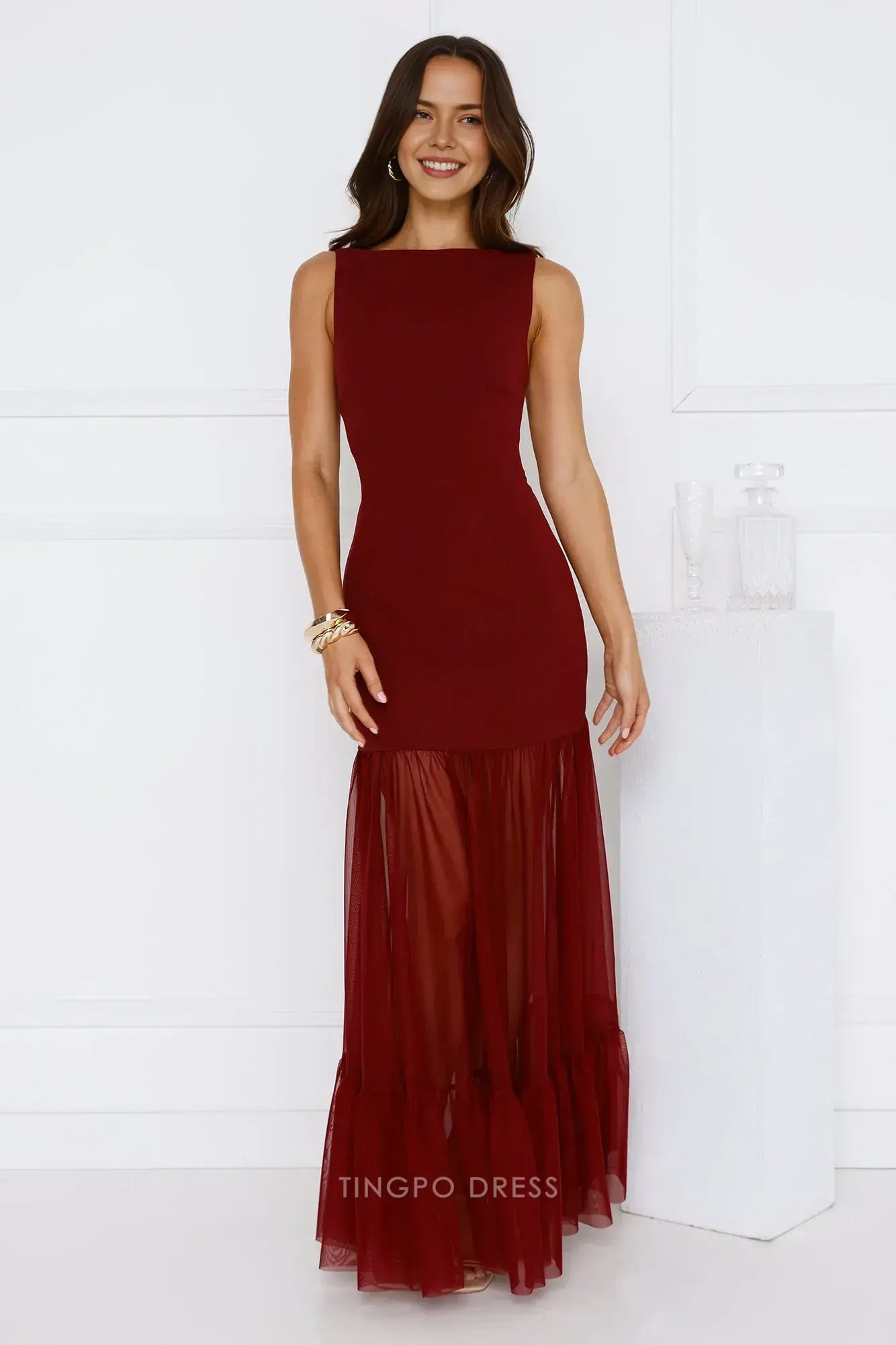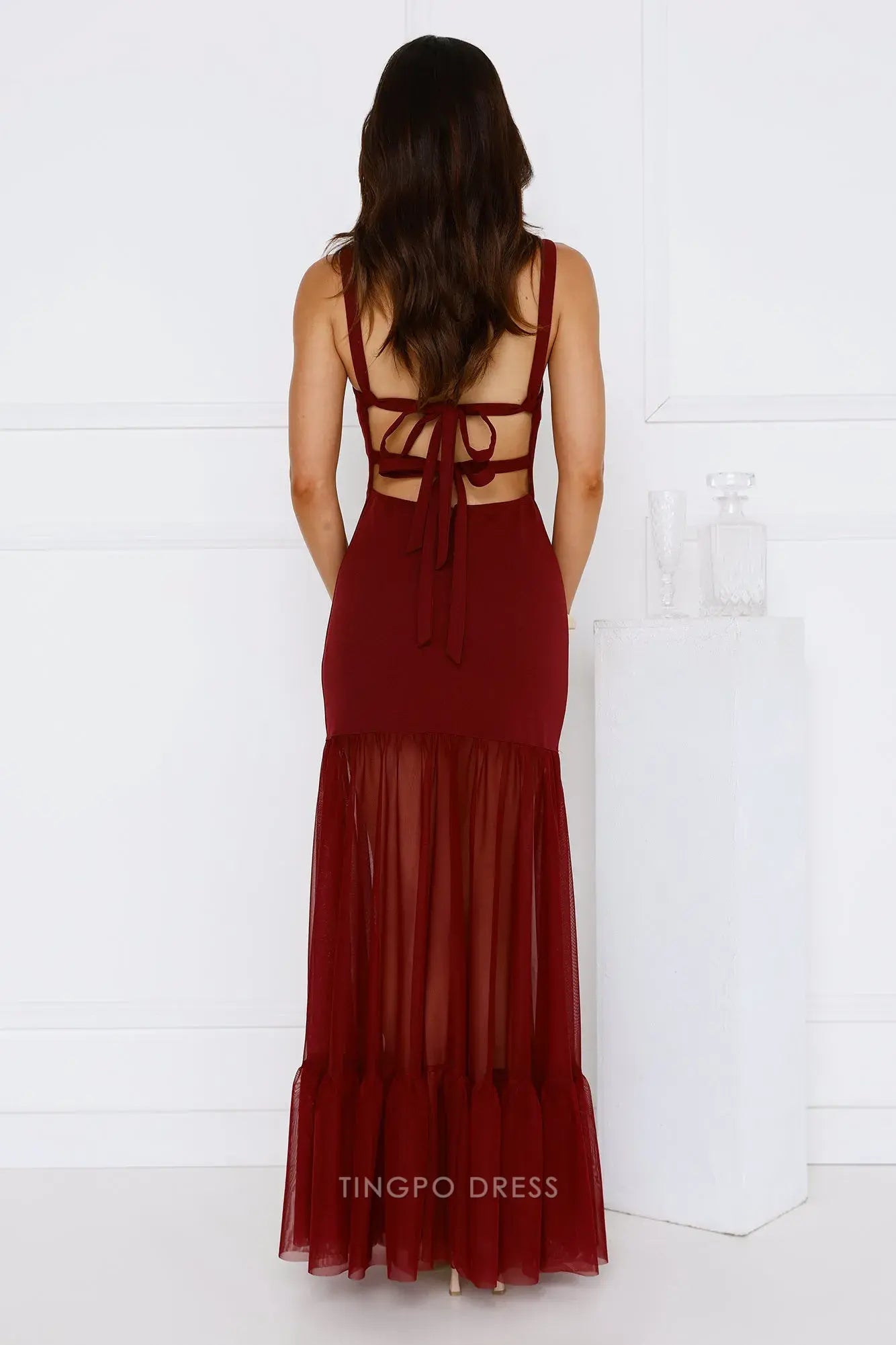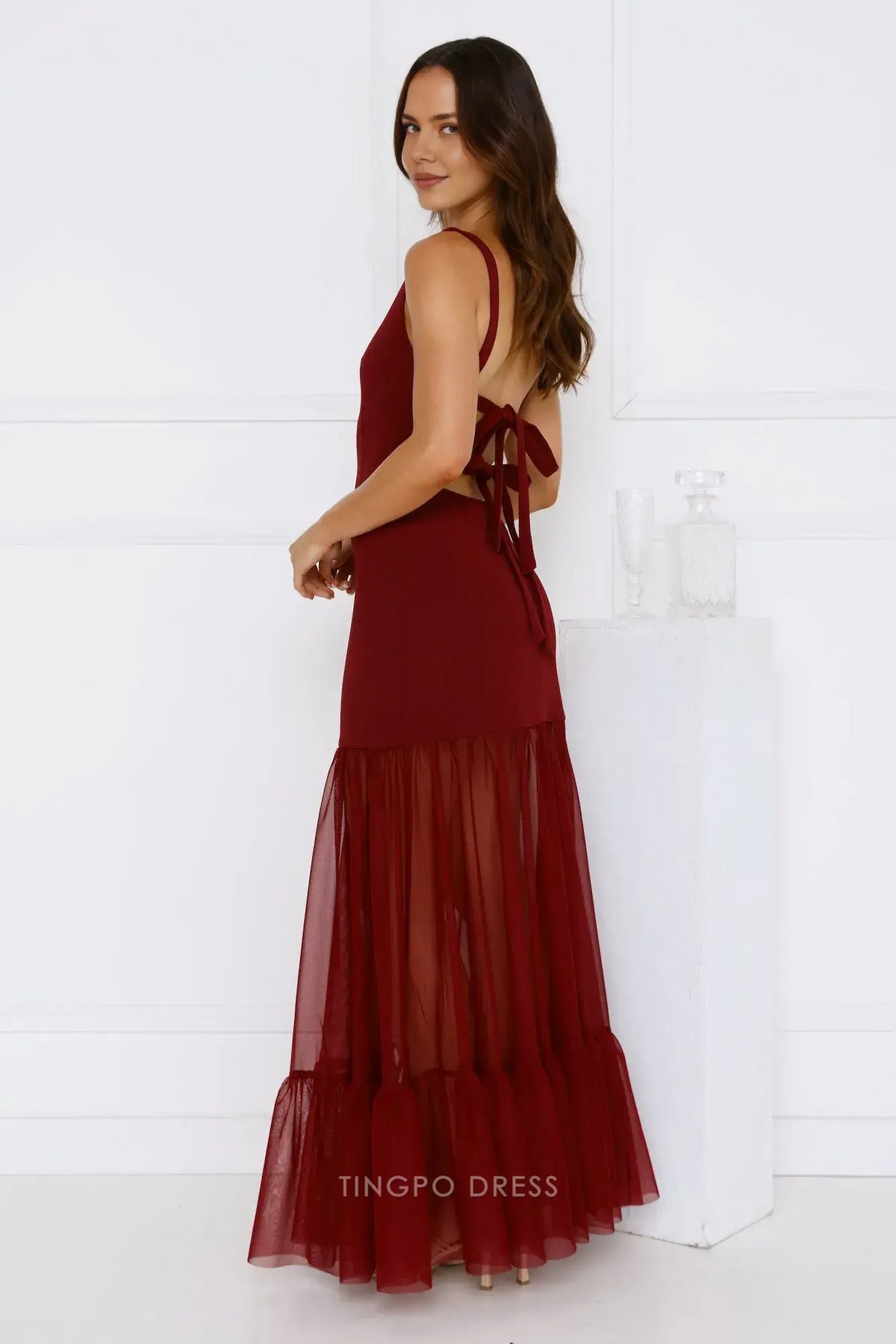 Step into elegance with Tingpo's sleeveless mesh ruffle maxi dress. The sleek bodice complements the flowing mesh ruffle skirt, while the back tie detail adds a touch of charm. Available in multiple vibrant colors, it's ideal for formal events,prom dress, weddings, or any occasion where you want to make a stylish statement.