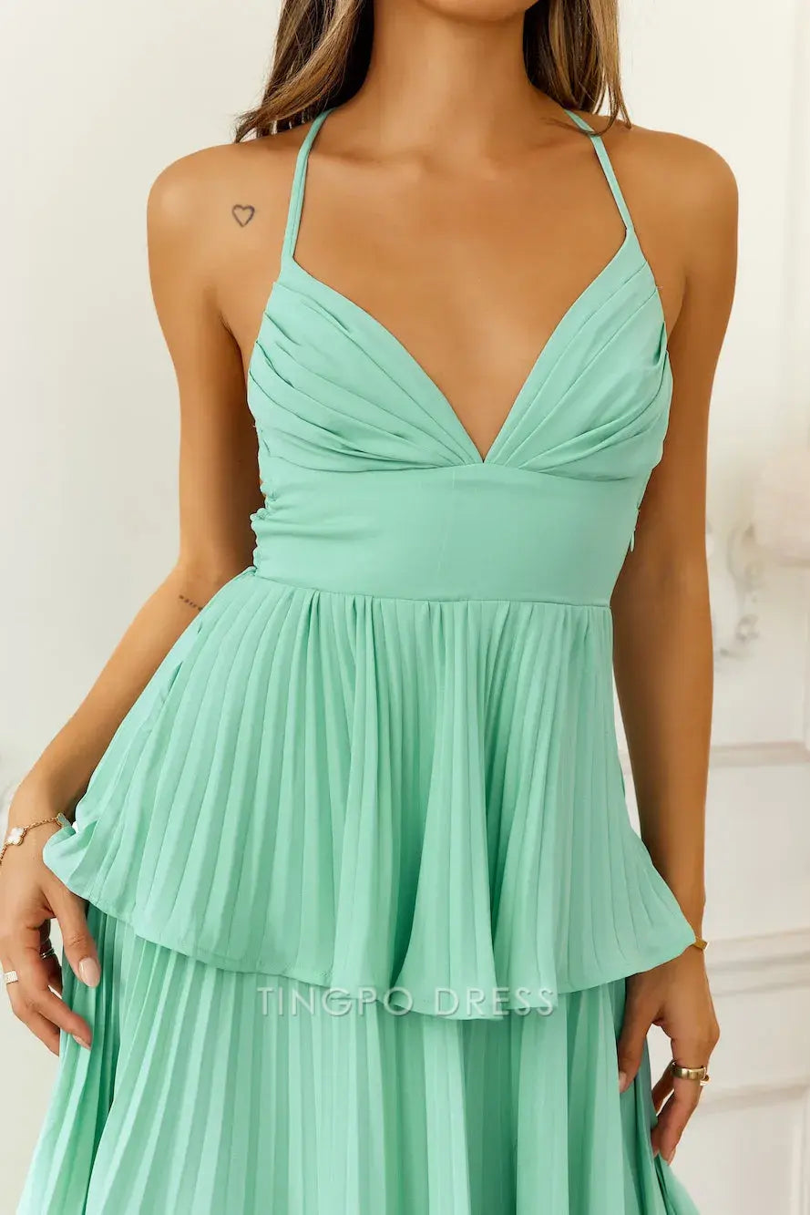 Step into elegance with Tingpo's tiered pleated maxi dress. Featuring a deep V - neckline and a flowing tiered pleated skirt, it also boasts a stylish criss - cross back design with a tie detail for a touch of allure. Available in multiple charming colors, this dress is perfect for weddings, parties,prom, or any special occasion where you want to look effortlessly chic.