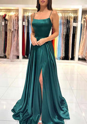 TingPo Wholesale A-line Square Neckline Spaghetti Straps Sweep Train Charmeuse Prom Dress With Split