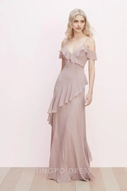 TingPo Wholesale Elegant Blush Pink Spaghetti Strap Off-Shoulder Dress - Ruffled Asymmetric Hem Evening Gown