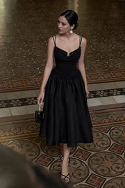 TingPo Wholesale Simple A line Spaghetti Straps Black Satin Prom Dresses Birthday Outfits