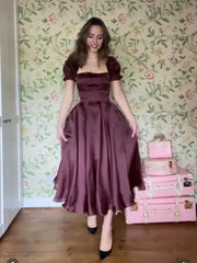TingPo Wholesale Simple A line Square Neckline Short Sleeves Satin Prom Dresses Birthday Outfits
