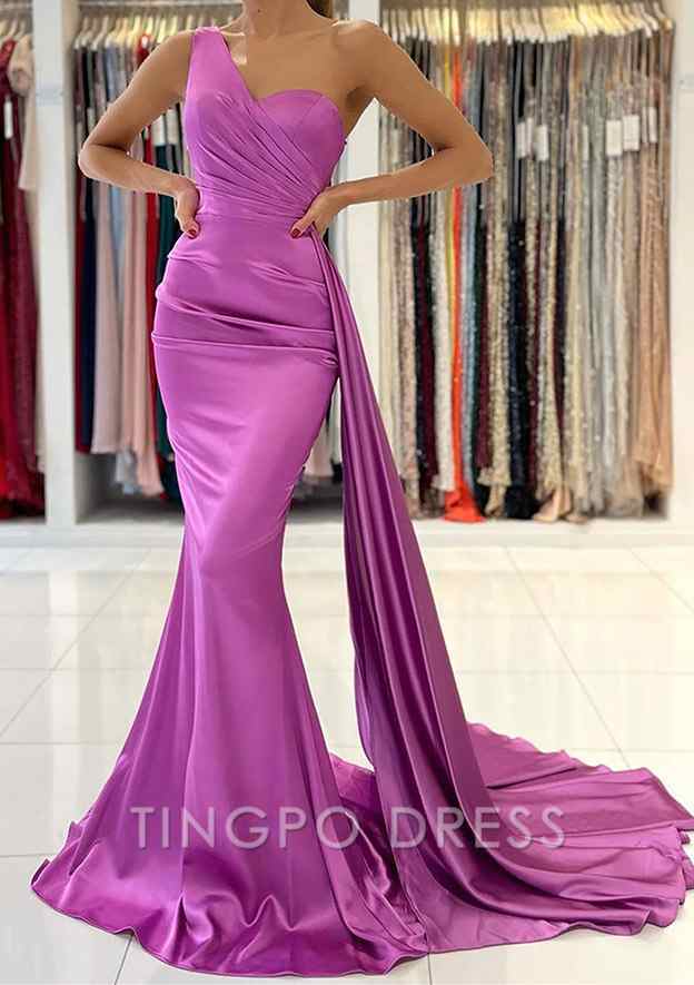 TingPo Wholesale Trumpet/Mermaid One-Shoulder Sleeveless Sweep Train Satin Prom Dress With Pleated