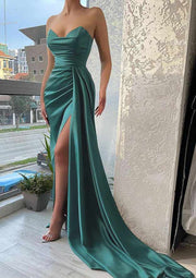 TingPo Wholesale Trumpet/Mermaid Sweetheart Strapless Court Train Satin Prom Dress With Pleated Split