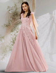 Wholesale A-Line Beautiful Back Floral Open Back Engagement Prom Dress V Neck Backless Sleeveless Floor Length Tulle with Bow(s) Appliques - US 2 / UK 6 / EU 32