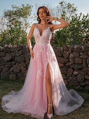 Wholesale A-Line/Princess Tulle Applique V-neck Sleeveless Sweep/Brush Train Dresses