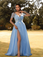 Wholesale A-Line Prom Dresses Floral Dress Wedding Guest Engagement Sweep / Brush Train Short Sleeve V Neck Tulle with Slit Appliques - US 2 / UK 6 / EU 32