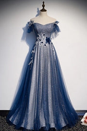 Wholesale Blue Tulle Long A-Line Prom Dress Off the Shoulder Evening Party Dress