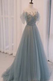 Wholesale Blue Tulle Sequins Long Prom Dress A-Line Scoop Neckline Party Dress