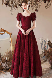 Wholesale Burgundy Satin Floor Length Prom Dress A-Line Short Sleeve Evening Party Dress