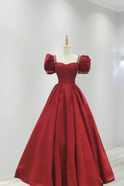 Wholesale Burgundy Satin Long Prom Dress A-Line Short Sleeve Evening Dress