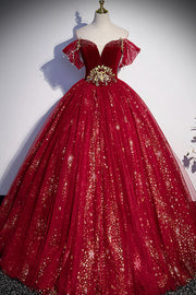 Wholesale Burgundy Tulle Long A-Line Ball Gown Off the Shoulder Evening Party Dress