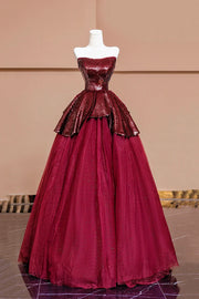 Wholesale Burgundy Tulle Sequins Long Prom Dress A-Line Strapless Evening Party Dress - US 2 / UK 6 / EU 32