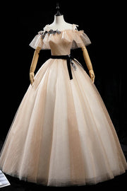 Wholesale Champagne Shiny Tulle Floor Length Prom Dress Off the Shoulder Evening Dress - US 2 / UK 6 / EU 32