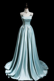 Wholesale Cute Satin Long A-Line Prom Dress Ice Blue Spaghetti Straps Evening Dress
