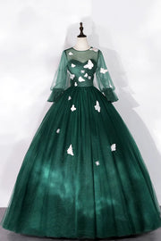 Wholesale Dark Green Tulle Long Prom Dress A-Line Long Sleeve Evening Party Dress with Butterfly Appliques - US 2 / UK 6 / EU 32