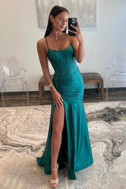 Wholesale Green Spaghetti Straps Mermaid Long Satin Prom Dress with Slit prom dresses shops