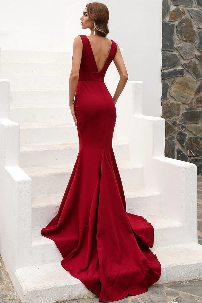 Wholesale Mermaid Deep V-Neck Prom Dress Sleeveless Wine Sweep Train Evening Dress - US 2 / UK 6 / EU 32