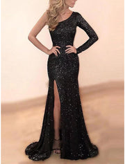 Wholesale Mermaid / Trumpet Prom Dresses Maxi Dress Wedding Guest Party Wear Sweep / Brush Train Long Sleeve One Shoulder Sequined with Sequin Slit
