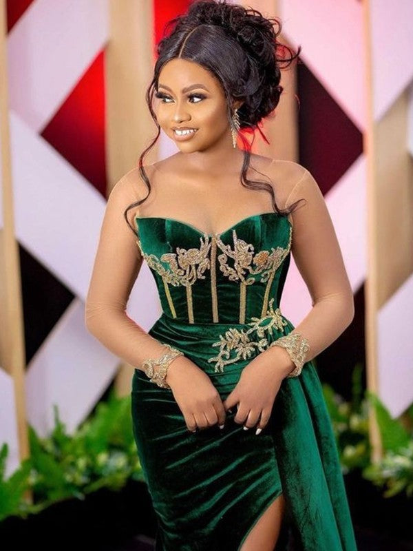 Wholesale Sheath/Column Velvet Applique Scoop Sleeveless Sweep/Brush Train Dresses