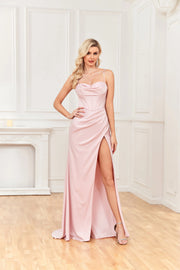Wholesale Sheath Satin Spaghetti Straps Cowl Neck Ruched Long Prom Dress With Silt - As picture 1 / US 2 / UK 6 / EU 32
